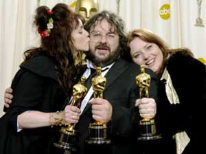 Priserna och de personer som tog emot statyetterna var, i den ordning som de delades ut: Flera av dessa vann också för någon/några av de första två Härskarringen-filmerna. Det var den tredje raka vinsten för teamet runt visuella effekter. I make-up-kategorin belönades även Sagan om ringen. Howard Shore tog hem sin andra Oscars för filmerna, han vann också för Sagan om ringen. Alla de övriga var förstagångsvinnare vad gäller filmtrilogin. Oscars-galan sköttes med van hand av värden Billy Crystal. Han hade gjort en rolig filmad introduktion där han spelade roller i alla de nominerade till bästa film. Han var bland annat en fantastisk Gollum och Aragorn i samspråk med Gandalf -- som dessutom spelades av Jack Nicholson på slutet! Ju längre kvällen led, desto fler priser norpade Sagan om konungens återkomst åt sig. Det blev nästan komiskt till sist. Billy Crystal skämtade om att det snart inte fanns några fler människor kvar att tacka på Nya Zeeland. Vinnarna i kategorin bästa utländska film (där Ondskan förlorade mot den kanadensiska filmen The Barbarian Invasions) sade i sitt tal att de var tacksamma för att Sagan om konungens återkomst inte kunde nomineras i deras kategori. Peter Jackson fick hoppa upp på scenen tre gånger. Först tillsammans med Boyens och Walsh för at ta emot manuspriset. Han höll en kort stund senare ett föredömligt kort tacktal för sin vinst av regipriset och tackade sin mamma och pappa, som stöttat honom i att göra filmer ända sedan barndomen. Båda föräldrarna avled under tiden som Härskarringen-trilogin spelades in och Jackson beklagade att de inte fått se det färdiga resultatet. Till sist, när det stod klart att SOKÅ även vann priset för bästa film, klev han upp tillsammans med bland andra alla de av filmens skådespelare som fanns i salongen: Elijah Wood, Dominic Monaghan, Billy Boyd, Sean Astin, Sir Ian McKellen och Liv Tyler. Med tårar i ögonen lyssnade de på Jackson och Barrie M Osborne. Osborne kom ihåg att tacka JRR Tolkien, och riktade också ett särskilt tack till alla de fans som stöttat filmerna hela vägen. Men så värst komiskt eller rörande var det nog inte för teamet kring till exempel Master and Commander, som nominerats till tio Oscars, men bara tog två - båda i kategorier där SOKÅ inte var nominerad, foto och ljudklippning. Andra storfavoriten Mystic River vann endast två Oscars för sina båda manliga skådespelare. Och Lost in Translation vann priset för bästa originalmanus. Även i dessa kategorier saknades konkurrensen med SOKÅ. Kort sagt, Sagan om konungens återkomst gick fram som en ångvält över alla konkurrenter. Och trots att jag tycker att alla de tre ovannämnda övriga favoriterna är underbara filmer, så var det faktiskt rätt film som vann just i år. En fantastisk natt för Tolkienfans och filmfantaster! |