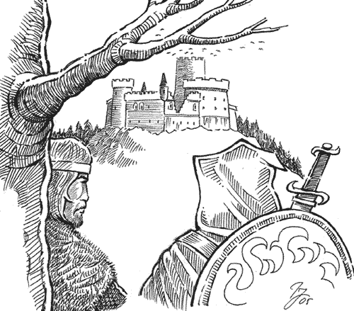 över de mörka fasaderna. I förgrunden löpte en liten flod längsmed borgmuren;